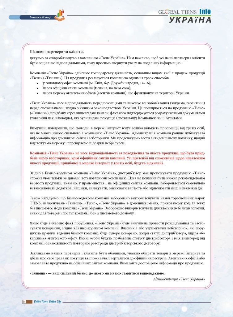 Компанія ТОВ «Тієнс Україна» гарантує якість та офіційне походження лише тієї продукції торгової марки TIENS, що була придбана у цьому інтернет-магазині та через мережу офіційних агентських офісів.