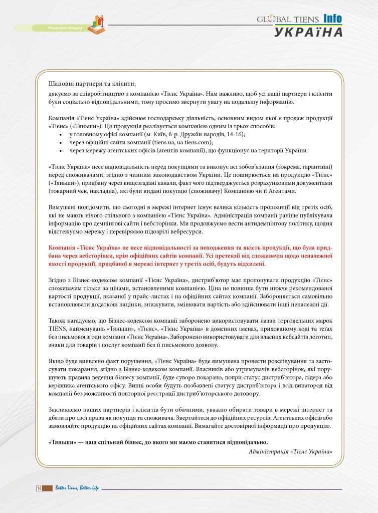 Компанія ТОВ «Тієнс Україна» гарантує якість та офіційне походження лише тієї продукції торгової марки TIENS, що була придбана у цьому інтернет-магазині та через мережу офіційних агентських офісів.