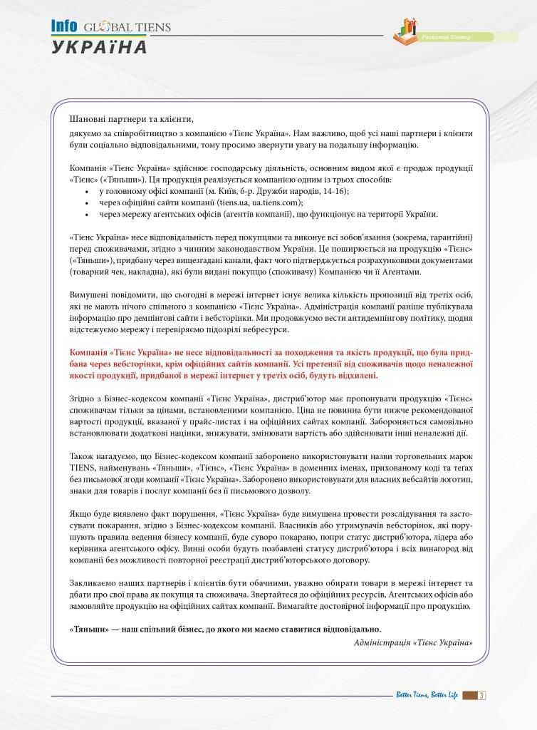 Компанія ТОВ «Тієнс Україна» гарантує якість та офіційне походження лише тієї продукції торгової марки TIENS, що була придбана у цьому інтернет-магазині та через мережу офіційних агентських офісів.